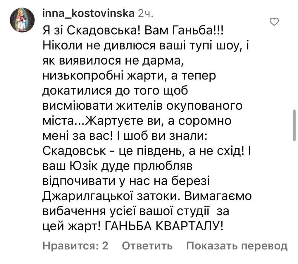 Возможно, действительно, в этой ситуации, неуместно было для шуток выбирать именно Скадовск, который сегодня находится под вражеской оккупацией. Но, этот номер не о "сиськи" и не о Скадовске. Этот номер о людях, которые в повседневном общении не решаются разговаривать на украинском, опасаясь того, что разговаривая с ошибками, они как-то не так будут выглядеть в глазах других людей. Поэтому главный месседж этого номера в том, что ошибаться не стыдно. Стыдно в своей стране не разговаривать на родном языке, - написал комик.