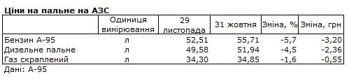 Средняя стоимость бензина А-95 на конец октября составила 52,51 гривны за литр, что на 3,20 гривны меньше, чем месяцем ранее. Дизельное топливо подешевело до 49,58 гривен за литр (снижение на 2,36 гривны), а автогаз — до 34,30 гривны за литр (минус 0,55 гривен).