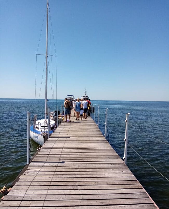 Після лікувально-розважальних процедур ми вирушили у Скадовськ , а вранці попливли на острів Джарилгач. Корабель прибуває туди кількома ранковими рейсами, а повертається о 17:00 або 18:30. "Українські Мальдіви" можуть порадувати найчистішої прозорою водою, білим піском і доброзичливими дельфінами. Пляжі ідеально підходять для дітей. Серед цікавих місць є старовинний маяк, а протяжність острова в 60 км дозволяє піти подалі від людей і кафе на причалі. Єдиний мінус - тінь на острові знайти складно, тому люди зі світлою шкірою обгорят майже гарантовано. А ще тут водяться степові гадюки і каракурти, тому варто дивитися під ноги.