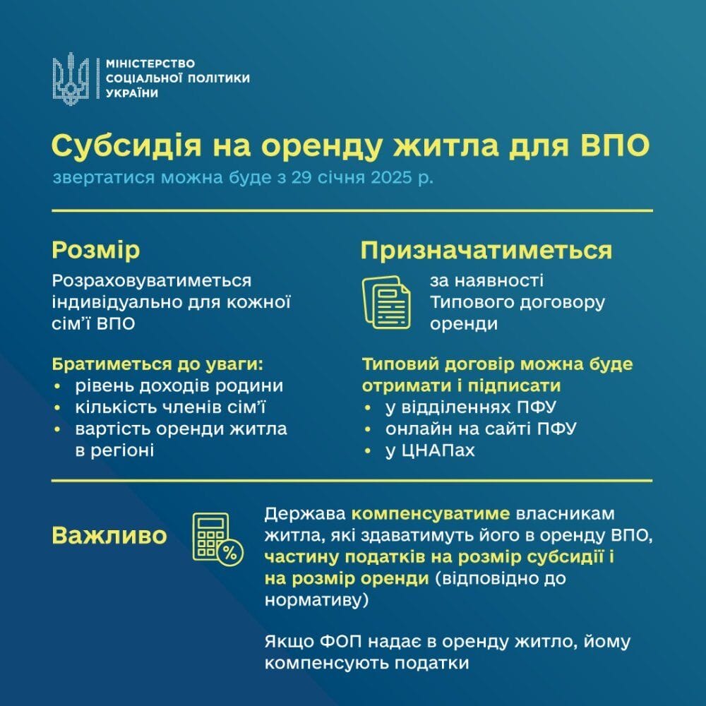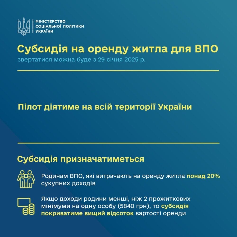 З 29 січня 2025 року внутрішньо переміщені особи (ВПО), які винаймають житло в Києві та інших регіонах України, зможуть отримувати субсидію на оренду житла. Це рішення було ухвалено Міністерством соціальної політики України та КМДА, в рамках програми "Зимова підтримка".